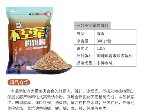 这款不空军的饵料成分有植物蛋白、鲜螺肉、南极磷虾、沙蚕等搭配多种氨基酸、诱食剂等制作而成。这款饵料的一大优点之一就是已经集齐了大部分的多种成分,可以直接拿来使用一包就搞定,特别适合那些懒人钓友们。